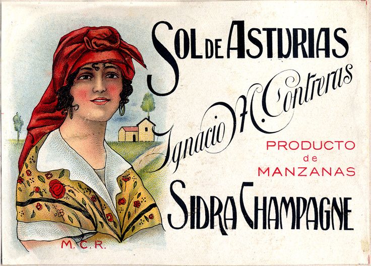 Observaciones: Etiqueta de sidre axampanao Sol de Asturias, de Ignacio F. Contreras, cola illustración d’una muyer asturiana, con pañuelu colloráu y una mantiella de flores.