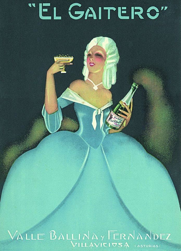 Observaciones: Cartelu de sidre El Gaitero, au apaez la illustración d’una muyer con vistíu azul, tipu «princesa»