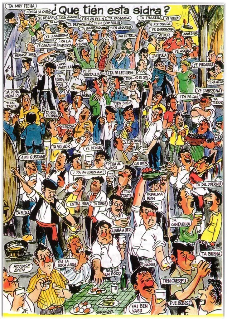 Observaciones: Cartelu debuxáu por Elías Antonio Garrido Barrientos, conocíu como Garrido. L’illustrador ñació n’Uxu en 1933 y morrió en 2019. Ye de finales de la década de 1970 o entamos de la de 1980. El cartelu garró muncha fama y axunta munchos personaxes n’una espicha, usando expresiones tradicionales nel mundiu la sidre. Podemos velo en munchos chigres.
