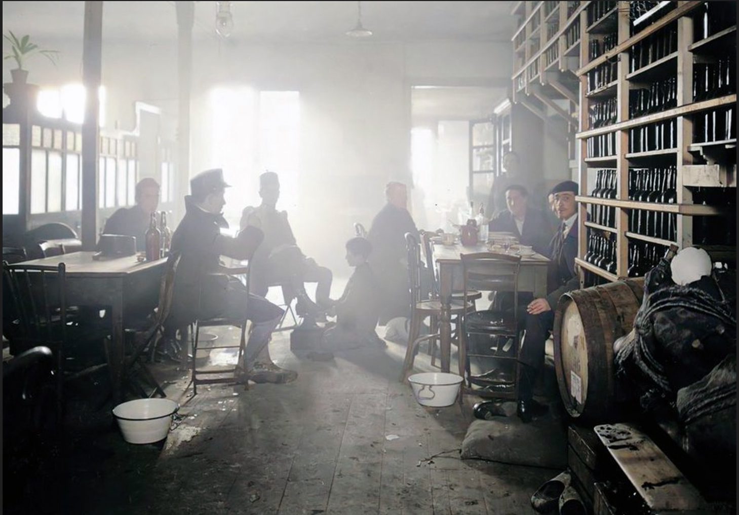Observaciones: La fotógrafa estadoxunidense Ruth Matilda Anderson, fexo la semeya d’esta tabierna de la cai Xovellanos d’Uviéu na que destaquen les botelles de sidre nes estanteríes y los trés militares de la manzorga que tan tomando sidre. (viendo les botelles que tan per detrás)