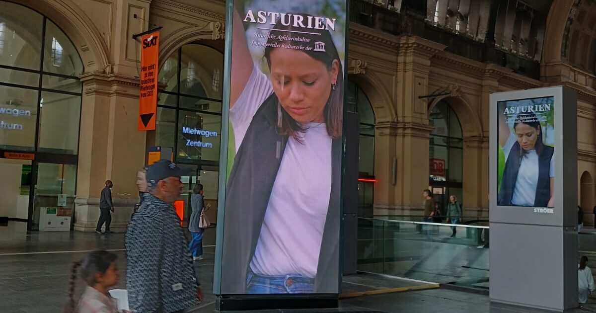Con esta idea de internacionalización, cual no sería nuestra sorpresa al entrar en la estación central de Frankfurt, conocida por su arquitectura monumental y por ser un centro neurálgico de los viajes por Europa, y encontrarnos con una cara conocida en una pantalla gigante, ofreciéndonos, si, un culín de sidra asturiana, bajo el lema “Cultura Asturiana de la Sidra, Patrimonio Universal de la Humanidad. Apúntate al Respetoturismo”.