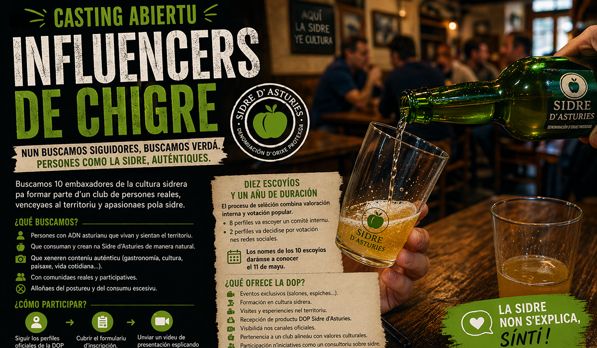 La DOP Sidre d’Asturies llanza la campaña “Influencers de Chigre” a la gueta de nuevos embaxadores de la cultura sidrera La DOP Sidre d’Asturias presentó una nueva campaña promocional cola que pretende captar nuevos perfiles pa divulgar la cultura sidrera asturiana nes redes sociales. Baxo’l nome de “Influencers de Chigre”, la